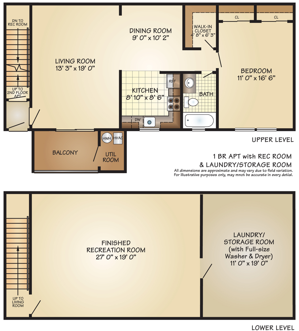 This one bedroom apartment with a recreation room has over 1500 square feet with two closets in the bedroom along with a large closet off the hallway. The is a lower level recreation room has a full size washer and dryer. There is a private balcony off the living room. The main level of the apartment is on the first floor of the building and has hard wood floors.