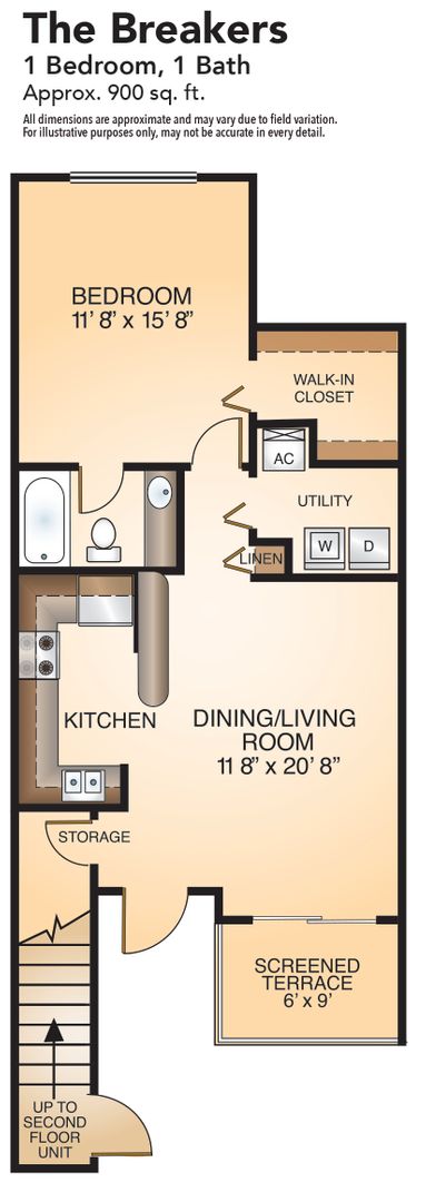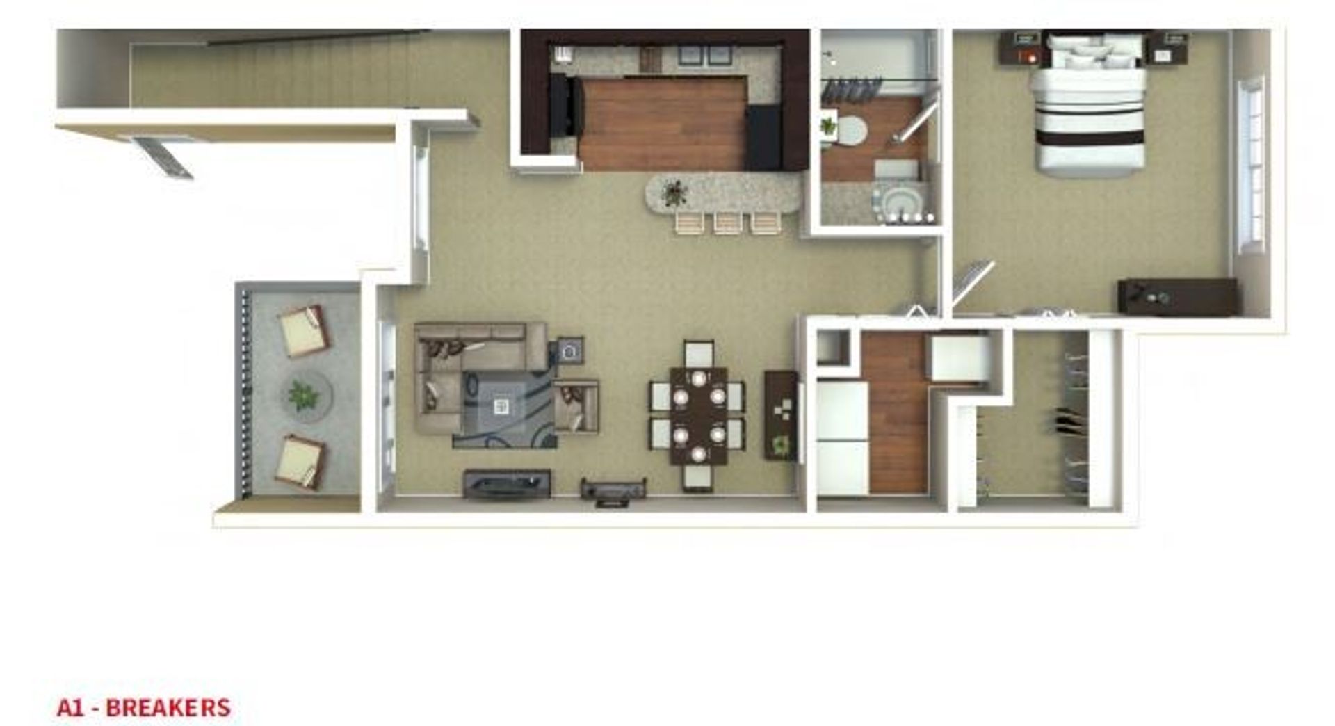 The Breakers Premium floor plan is huge with 900 square feet of space to spread out in. The perfect open floor plan that opens to you own private screened in outdoor area and has its own full-size washer and dryer in the unit.