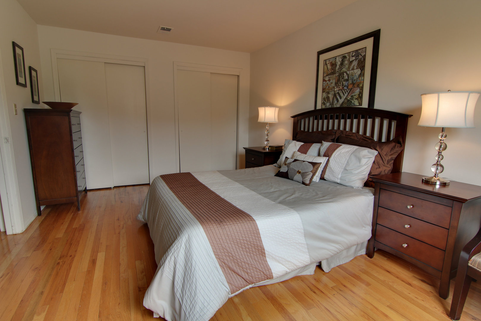 This one bedroom has over 750 square feet with two closets in the bedroom along with a walk in closet off the hallway. There is a private balcony off the living room. The apartment is on the top floor and has wood floors. Washer, dryer, gas stove, refrigerator and dishwasher in the apartment.