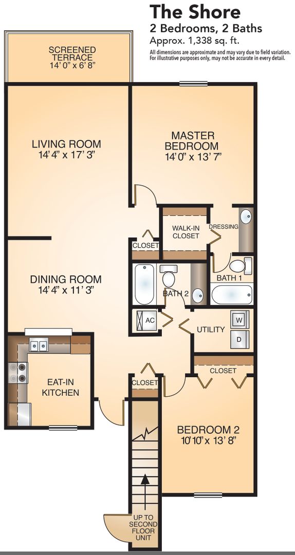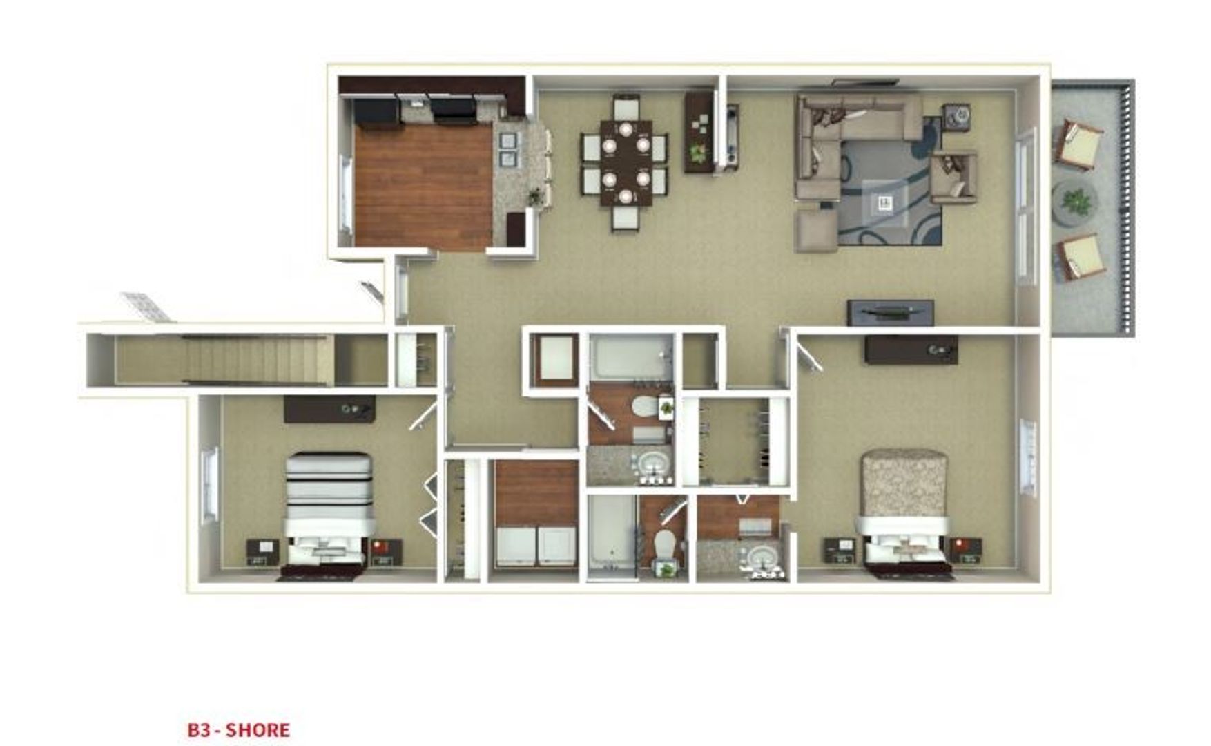 The Shore Two Bedroom, Two Bath floor plan is huge with 1,338 square feet of space to spread out in. The perfect open floor plan that opens to you own private screened in outdoor area and has its own full-size washer and dryer in the unit.