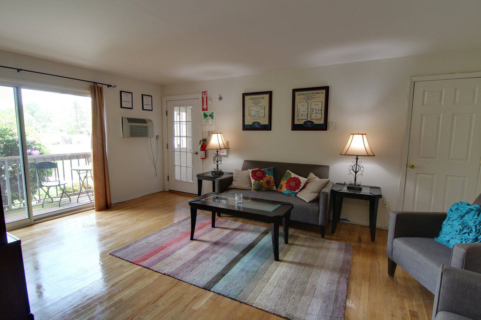 This 750 square foot one bedroom apartment is located on the second (top) floor and has hard wood floors. It has considerable storage space including a large closet in the bedroom and a walk in closet off the living room. The apartment comes with a refrigerator, dishwasher, electric range, and microwave (in select units). The apartment features a private balcony off the living room, with a large sliding door and includes an air conditioner.