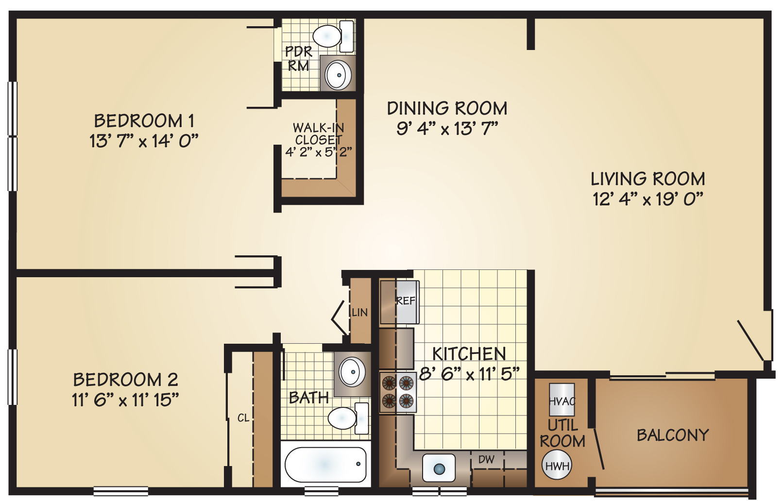 This two bedroom apartment has over 925 square feet of space and one and a half baths and a private balcony. The apartment is on the second floor and has hard wood floors. The kitchen has a refrigerator, range and dishwasher.