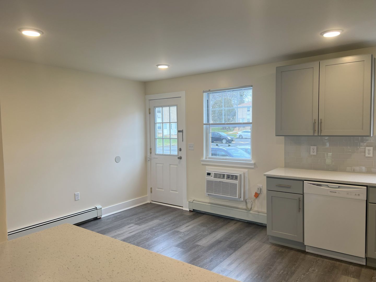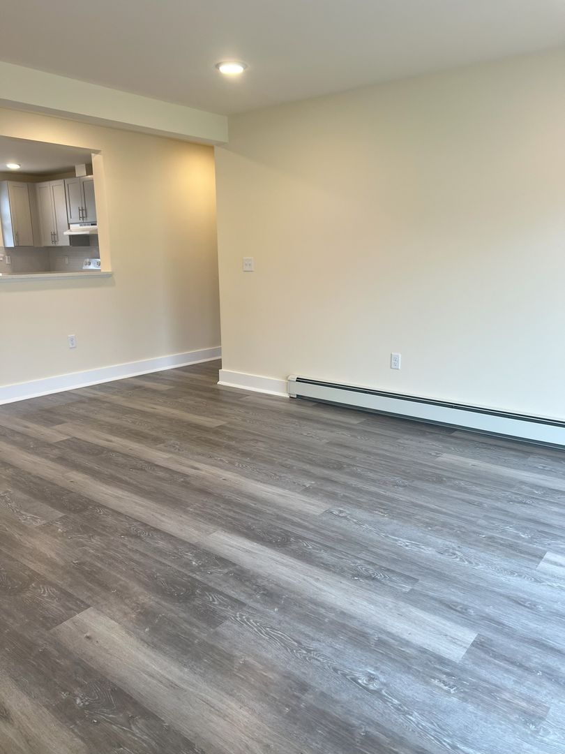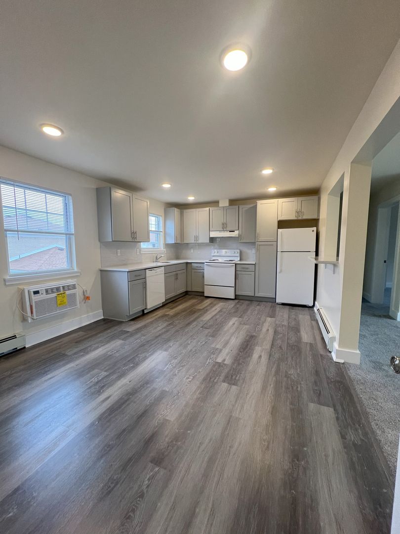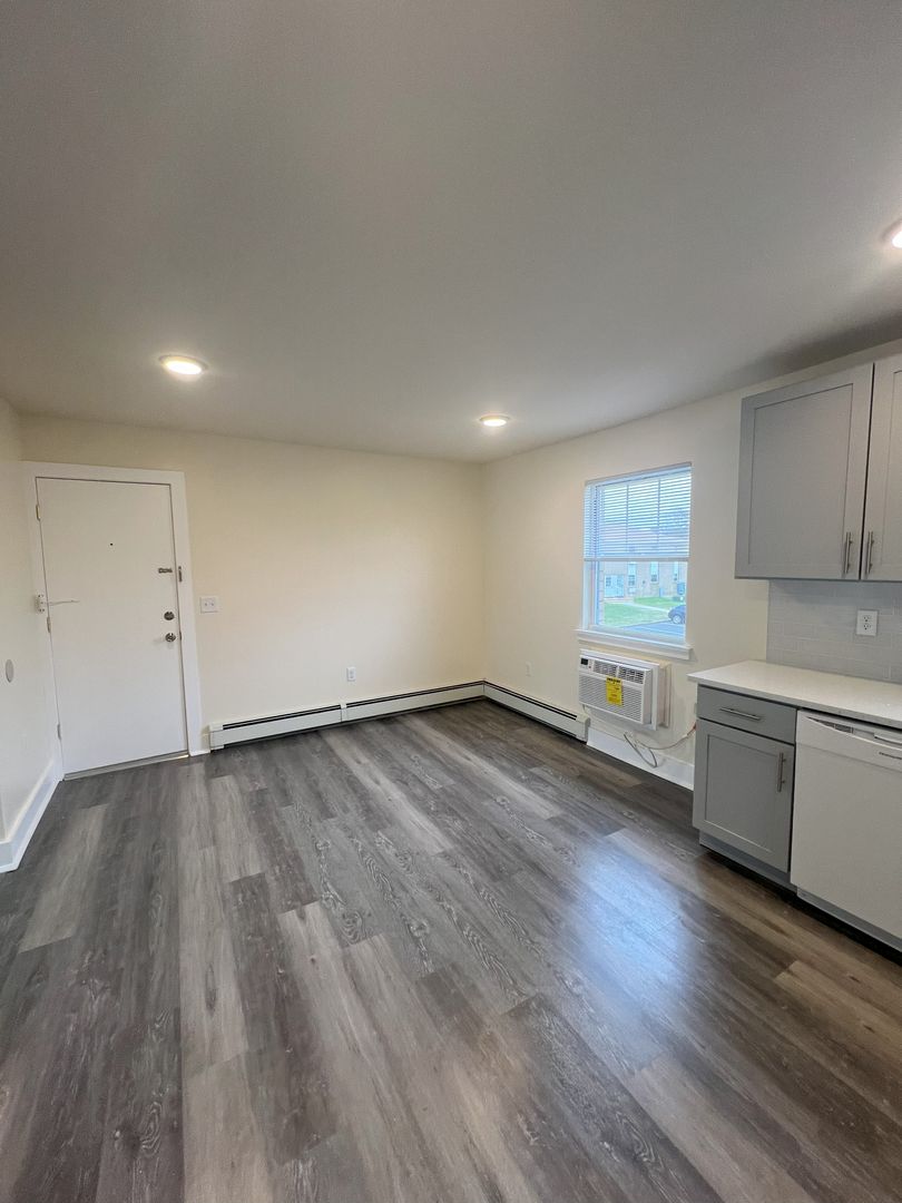 Unit 2705 is a 1 bedroom, 1 bathroom deluxe first floor apartment, offering approximately 725 sq. ft. of living space. The apartment has been completely rebuilt from top to bottom. It features dining room and modern kitchen with premium cabinets, quartz countertops, glass tile backsplash, and a passthrough counter into the living room. Appliances include a stove with oven, dishwasher, refrigerator and in-wall air-conditioner. This updated apartment features luxurious LVT flooring throughout, spacious closets with ventilated shelving, and recessed LED ceiling lighting. The spacious living room’s triple panel glass slider, leads to the balcony, and affords plenty of natural light. The roomy bedroom features a huge walk-in closet. Our remodeled bath contains ceramic tile flooring, and ceramic tiled surround, bathtub with shower and sliding, obscured glass doors. Rent includes heat and hot water, tenant does pay for electricity. There is an on-site laundry room in Building 23, just next door, which is available to tenants on a 24-hour basis, and ample on-site parking.